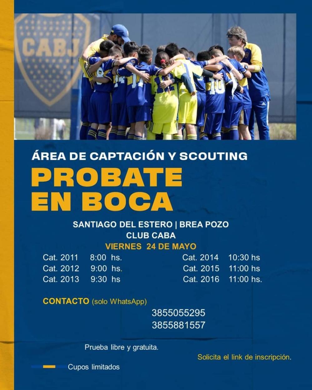 La Comisión Municipal de Brea Pozo anuncia que el viernes 24 de mayo, en el Club C.A.B.A, representantes del Club Boca Juniors llevarán a cabo pruebas de jugadores para las categorías 2.011, 2.012, 2.013, 2.014, 2.015 y 2.016.