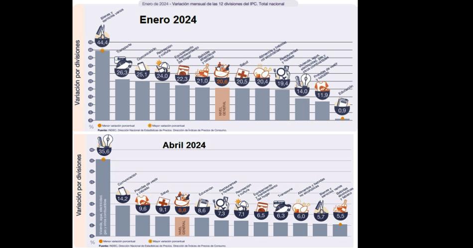 En tanto, según el dato de la inflación de abril, la división de mayor aumento en el mes fue Vivienda, agua, electricidad, gas y otros combustibles (35,6%) por los incrementos en las tarifas de gas, agua y electricidad.