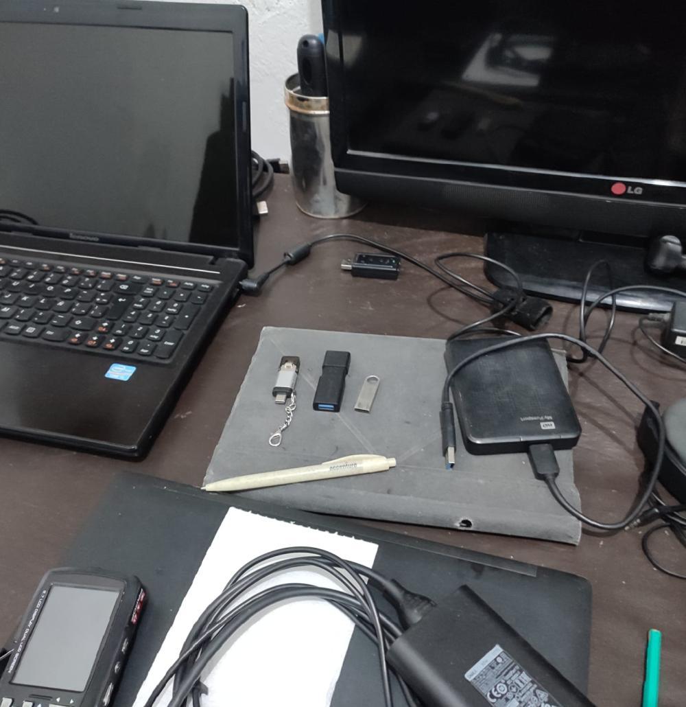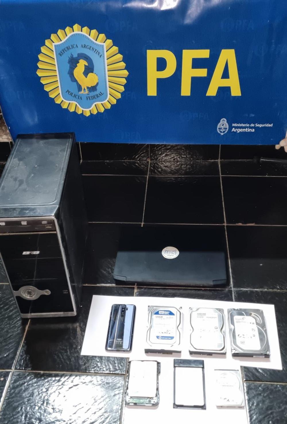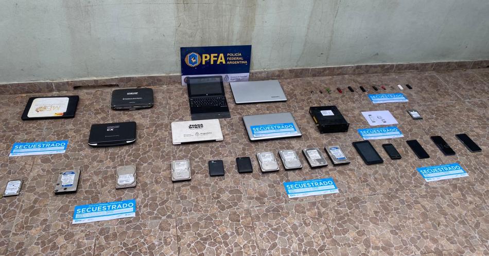 Asimismo, se procedió al secuestro de ocho teléfonos celulares, 21 discos rígidos, nueve notebooks, cinco memorias Micro SD, una CPU, un Modem, dos discos de almacenamiento externo, una tablet y doce pendrives.
