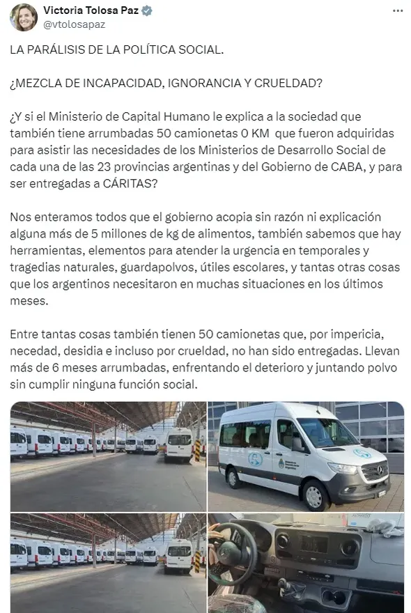 "La parálisis de la política social. ¿Mezcla de incapacidad, ignorancia y crueldad? ¿Y si el Ministerio de Capital Humano le explica a la sociedad que también tiene arrumbadas 50 camionetas 0 KM que fueron adquiridas para asistir las necesidades de los Ministerios de Desarrollo Social de cada una de las 23 provincias argentinas y del Gobierno de CABA, y para ser entregadas a CÁRITAS?", expuso este lunes Victoria Tolosa Paz en su perfil de X.