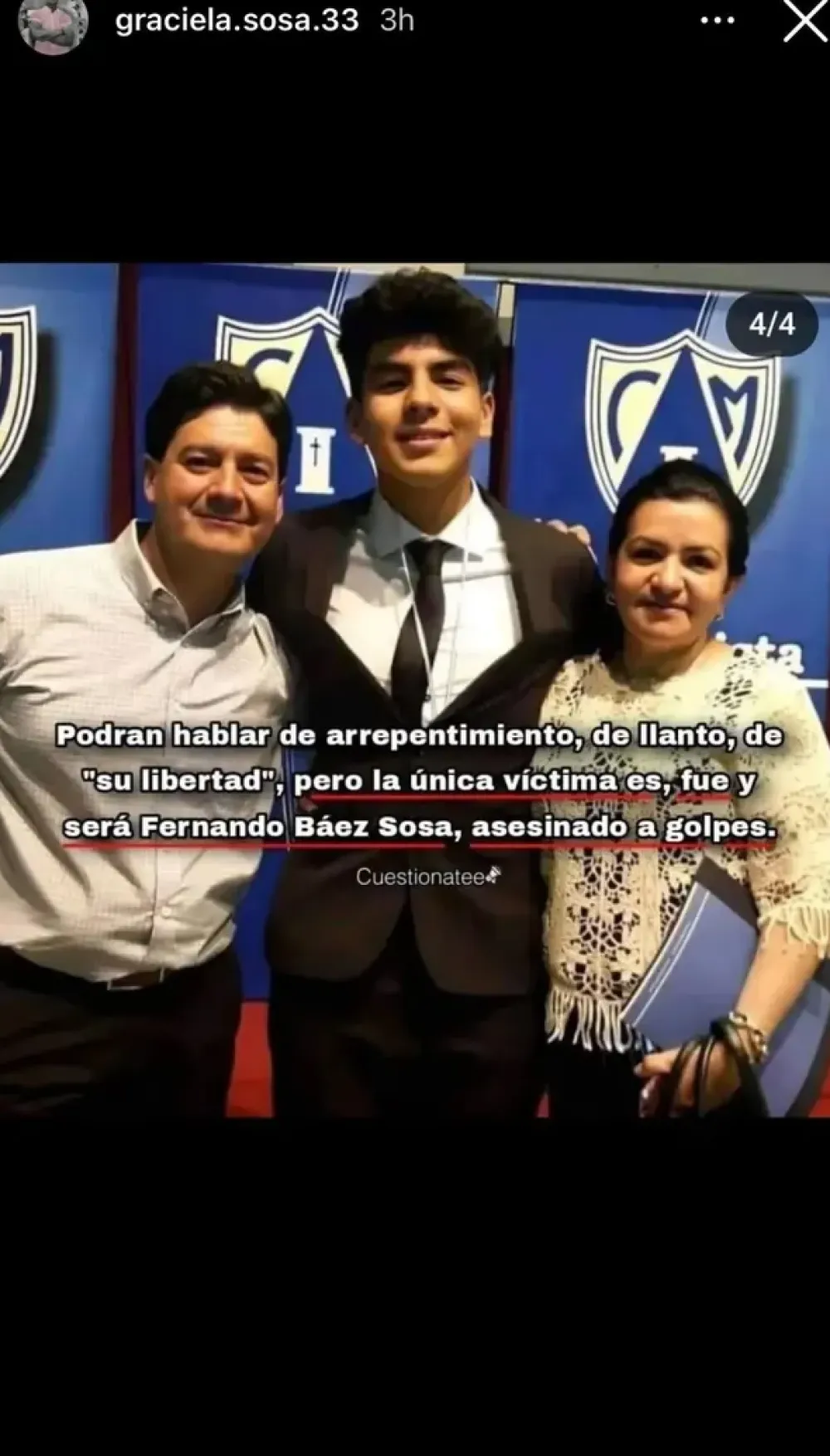 "Podrán hablar de arrepentimiento, de llanto, de 'su libertad', pero la única víctima es, fue y será Fernando Báez Sosa, asesinado a golpes", se lee en la historia que Graciela Sosa publicó en su cuenta de Instagram, junto a una foto en la que se la ve a ella y a su esposo, Silvino, y Fernando.