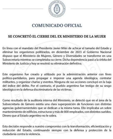 El Gobierno nacional anunció el cierre definitivo de lo que fue el Ministerio de Mujeres durante la gestión de Alberto Fernández. Ahora, la cartera tendrá rango de subsecretaría y estará bajo la órbita del Ministerio de Justicia.