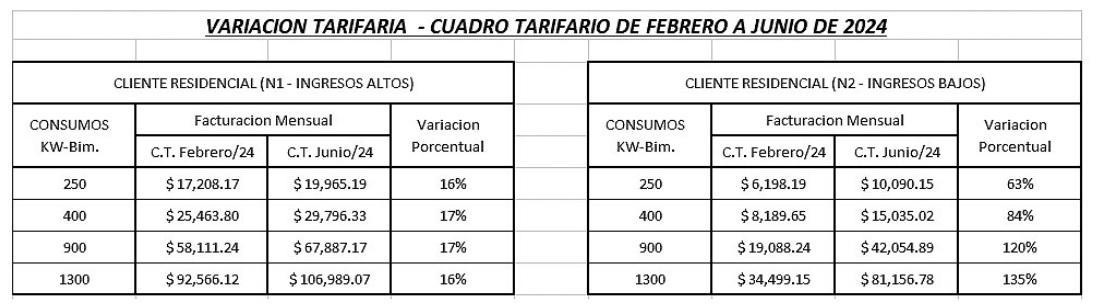 La variación tarifaria de febrero a junio en energía eléctrica, muestra el nivel preocupante del aumento en las boletas para clientes de ingresos medios y bajos. Responsabilidad del Gobierno nacional.