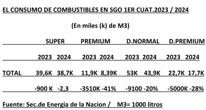 En este contexto, el consumo de naftas en todas las estaciones de servicio de la provincia, cayó en promedio, un 21% entre enero y abril de este año en Santiago, respecto de igual período del año pasado, con una baja más acentuada en la Premium que retrocedió un 41% y fue la caída más pronunciada entre todos los combustibles.