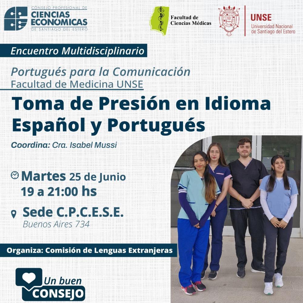 Estudiantes de medicina, en el marco de la cátedra de Portugués, harán toma de presión en idiomas español y portugués en la sede del complejo provincial de ciencias económicas, situado en calle Buenos Aires 734, este martes 25 de junio de 19 a 21 hs.