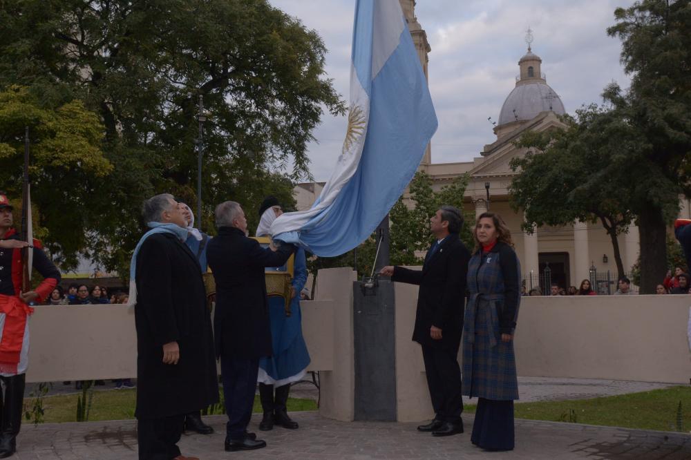 Las actividades conmemorativas comenzaron con el izamiento de la Bandera Nacional, a cargo del vicegobernador acompañado por el jefe de Gabinete, la intendente y el presidente del Poder Judicial.