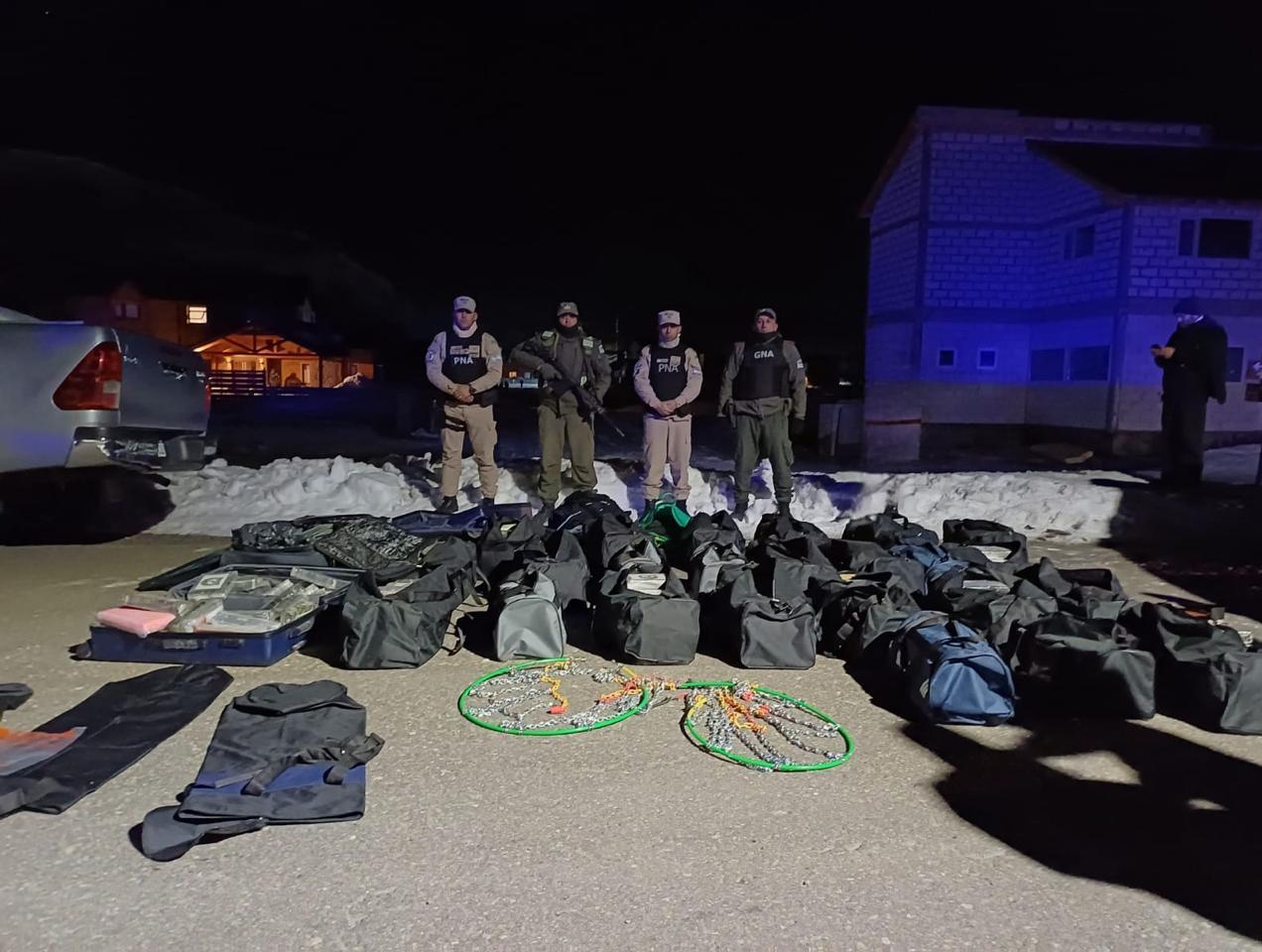 Los efectivos federales interceptaron tres vehículos que salían del complejo de cabañas, encontrando en su interior 783 kilos de cocaína, valuados en 15 millones de dólares. Además, se secuestraron dos equipos de comunicación satelital y dinero en efectivo en moneda nacional e internacional.