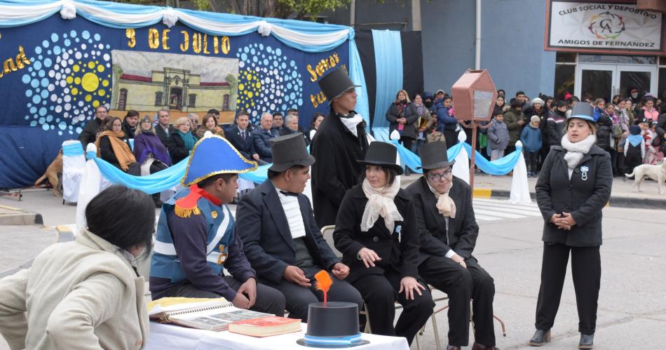 FERNÁNDEZ, Robles. Alumnos del CEI Nº 52 y de los jardines municipales le pusieron color y alegría a la gélida mañana del Día de la Independencia en la ciudad de Fernández, en un acto encabezado por el intendente, Víctor Araujo.