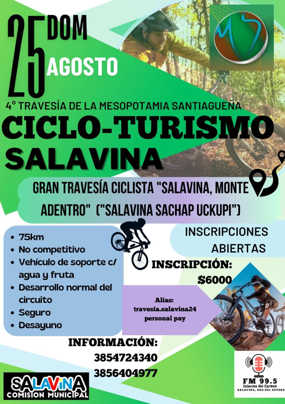 Gran travesía en bicicleta "Salavina, Monte Adentro". En la oportunidad, la comisionada municipal de Villa Figueroa, Gabriela Geréz Bravo, anunció el lanzamiento oficial, con la conferencia de prensa, de la 4ta Travesía en Bicicleta, No Competitiva de Reconocimiento, el 25 de agosto próximo, desde las 8,00 hs, por el Departamento Salavina, saliendo y volviendo a la localidad de Villa Salavina, desde el Complejo Social El Tanicu, con un recorrido de 75 km, en un circuito único por sus características que será un placer para los que gustan del cicloturismo de cercanía o de aventura. Las inscripciones cierran el 22 de agosto, fecha fija e inamovible, con un valor de $ 6000, que cubre seguro, soporte saludable y apoyo técnico y las mismas se registran en 385 4724340/6404977. Se prevé un importante cierre en el complejo El Tanicu, con muestras de artesanos, emprendedores, comidas regionales y actuaciones artísticas, prometiendo ser una gran fiesta de encuentro de deporte, diversión y entretenimiento.