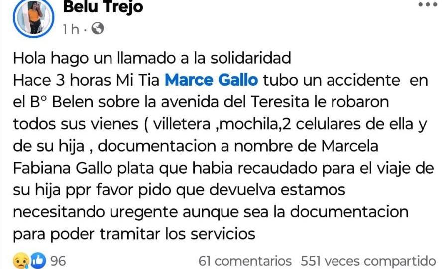 En el posteo, la adolescente escribió: "Hola hago un llamado a la solidaridad. Hace 3 horas mi tía tuvo un accidente en el B° Belén sobre la avenida del Teresita, le robaron todos sus bienes (billetera, mochila, 2 celulares de ella y de su hija, documentación y la plata que había recaudado para el viaje de su hija) por favor pido que lo devuelvan, estamos necesitando urgente. Aunque sea la documentación para poder tramitar los servicios".