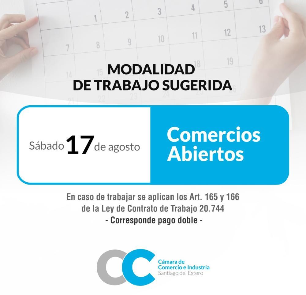 La Cámara de Comercio e Industria recordó la modalidad de trabajo sugerida para este sábado 17 de agosto, día en que se conmemora el paso a la inmortalidad del Gral. San Martín.