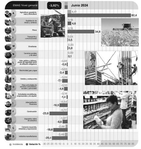 Según informó el Indec, con relación a igual mes de 2023, seis sectores de actividad que conforman el Emae registraron subas en junio, entre los que se destacan Agricultura, ganadería, caza y silvicultura (+82,4% ia) y Explotación de minas y canteras (+4,6% ia).