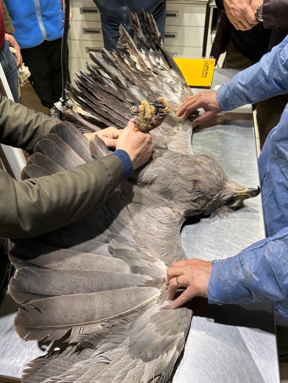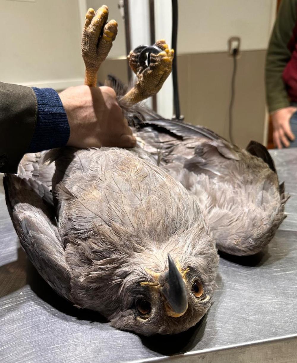 El ejemplar recibió atención veterinaria debido a que no podía volar. La están tratando por una fisura en un ala.