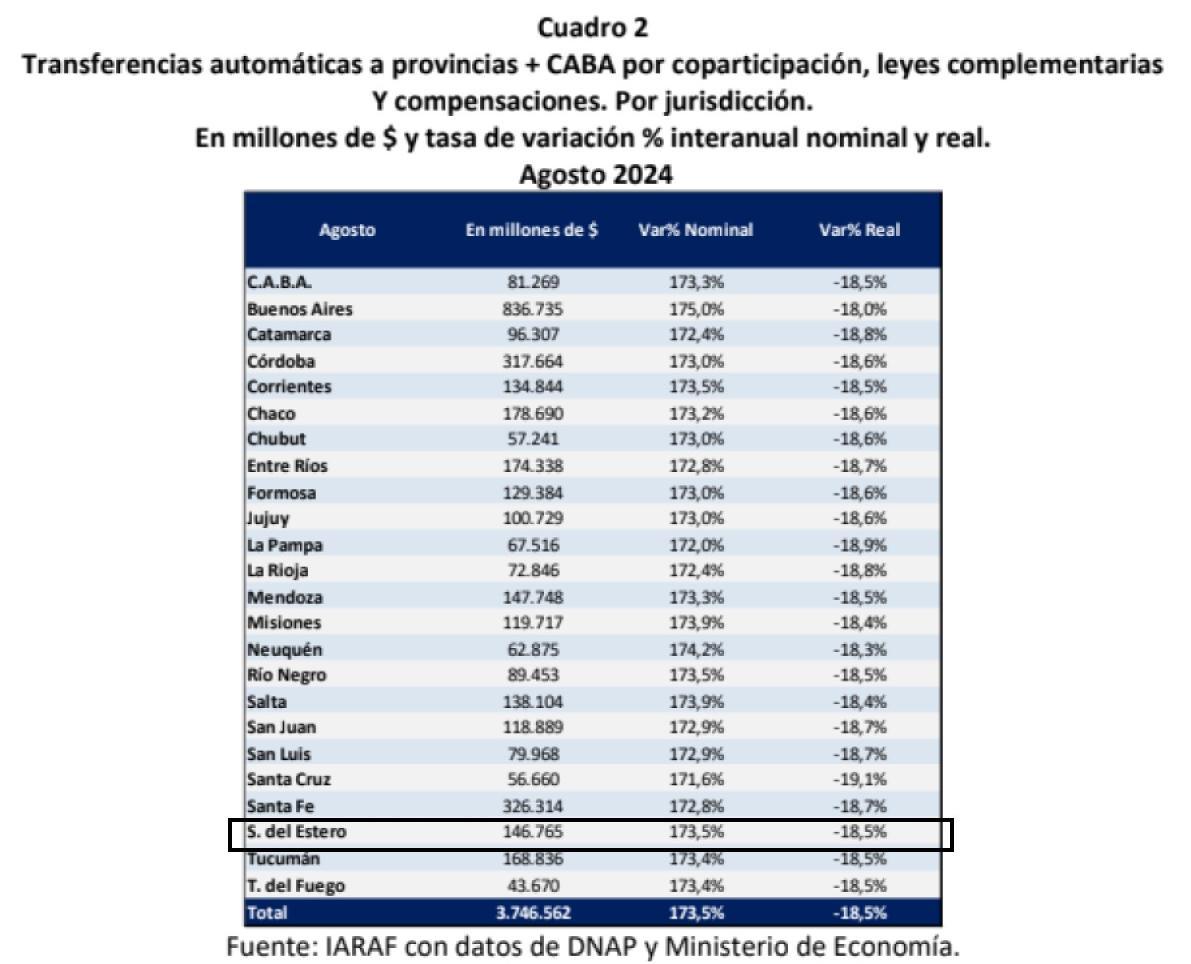 En el caso puntual de Santiago del Estero, se advierte un 18,5% de caída de ingresos en agosto, interanual, en concepto de coparticipación, leyes complementarias y compensaciones, medido en términos reales.
