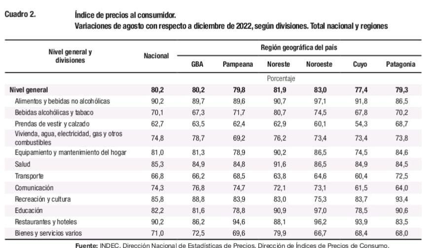 En la inflación acumulada de enero a agosto, el nivel general dio 80%, pero el Noa tuvo un 83%, de nuevo, la inflación acumulada más alta del país.