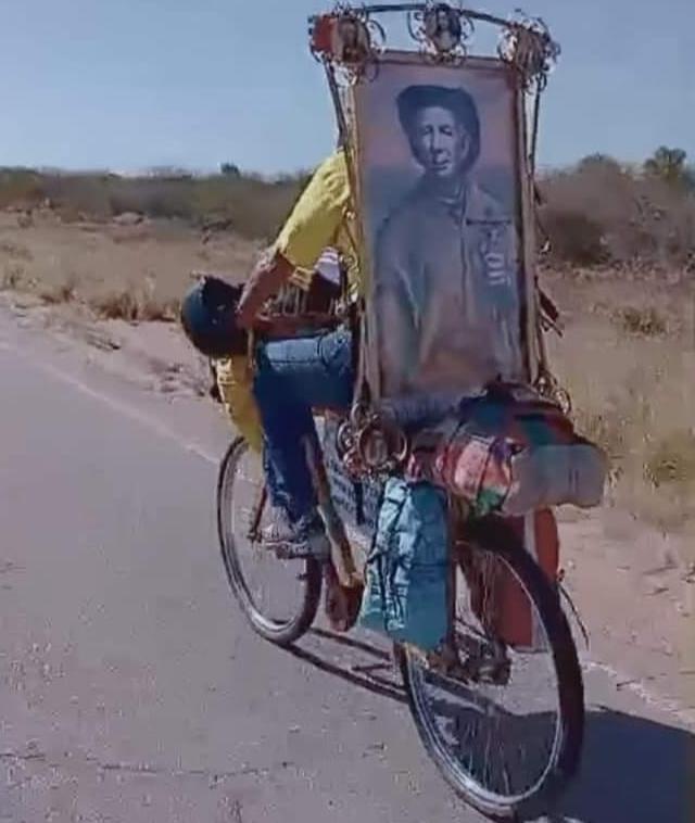 "Hace un par de semanas que salí desde Villa Sarmiento que está a cincuenta kilómetros de la ciudad de Córdoba. Ahora estoy llegando a Casa de Piedra, Catamarca, y estimo que si todo marcha bien como viene pasando, este fin de semana estaré llegando a Silípica para honrar a la Santa Mama Antula", comentó Oscar Walter Rojas cuando habló con EL LIBERAL y dio detalles de su larga peregrinación en una bicicleta, cuya estructura es totalmente de madera de quebracho colorado y su peso llega a los 50 kilogramos.