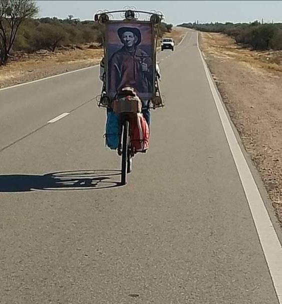 Oscar, ex director de cultura de la ciudad de Villa Dolores, es un fiel devoto y precursor de la obra de José Gabriel del Rosario Brochero, santificado como Cura Brochero, por lo que junto a él también trae montado en su bicicleta un retrato gigante del religioso cordobés.