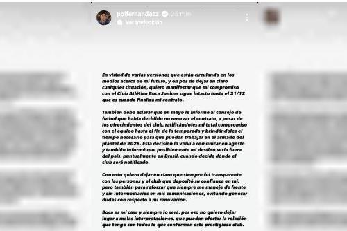 "En virtud de varias versiones que están circulando en los medios acerca de mi futuro, y en pos de dejar en claro cualquier situación, quiero manifestar que mi compromiso con el Club Atlético Boca Juniors sigue intacto hasta el 31/12 que es cuando finaliza mi contrato", comenzó su comunicado Pol Fernández.
