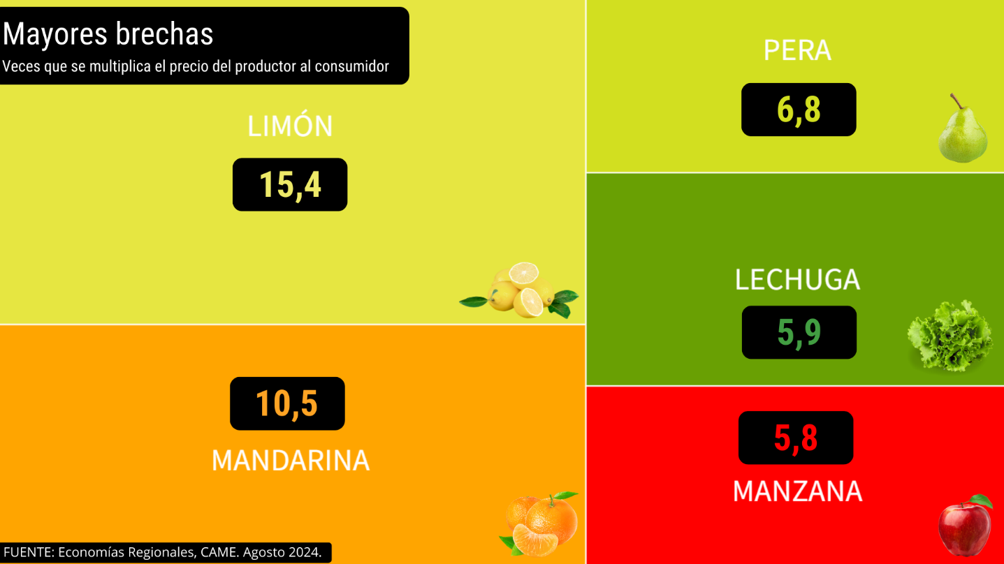 Entre los productos con mayores diferencias de precio en agosto, el limón encabezó la lista con una brecha de 15,4 veces. La mandarina (10,5), la pera (6,8), la lechuga (5,9) y la manzana roja (5,8) también presentaron amplias distancias entre lo que perciben los productores y lo que pagan los consumidores. El limón, con un incremento del 1% en origen y 17,4% en destino, sigue en una situación crítica, y algunos productores decidieron no cosechar debido a los bajos precios que no cubren los costos de producción.