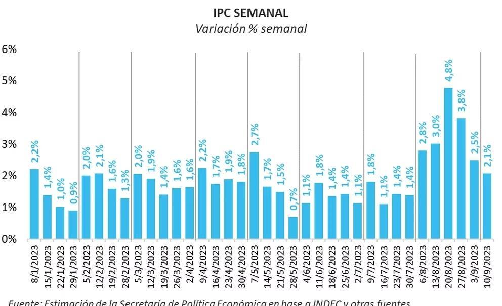 "Luego de un pico de inflación semanal estimado del 4,8% en la tercera semana de agosto, registro muy influenciado por la devaluación del día 14/8/2023, la inflación semanal fue cediendo", se indicó.