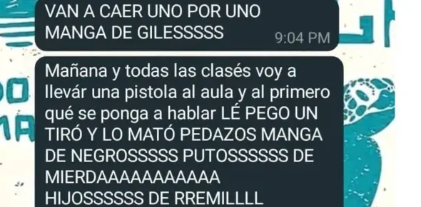 Continuó con insultos: "Manga de negros, put.. de mierda. Hijos de re mil put.. HDP", escribiendo en mayúsculas. Aunque algunos estudiantes optaron por ignorar los mensajes y hasta pidieron al administrador que lo eliminara del grupo, la situación se tornó seria cuando el martes el agresor se presentó a clases, compartiendo el aula con los mismos compañeros a quienes había amenazado.
