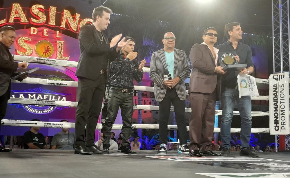 Paralelamente a las peleas iniciales hubo momentos para el homenaje y en este caso el que recibió una plaqueta por parte del intendente de la ciudad de Las Termas fue el ex púgil Fernando Sosa.