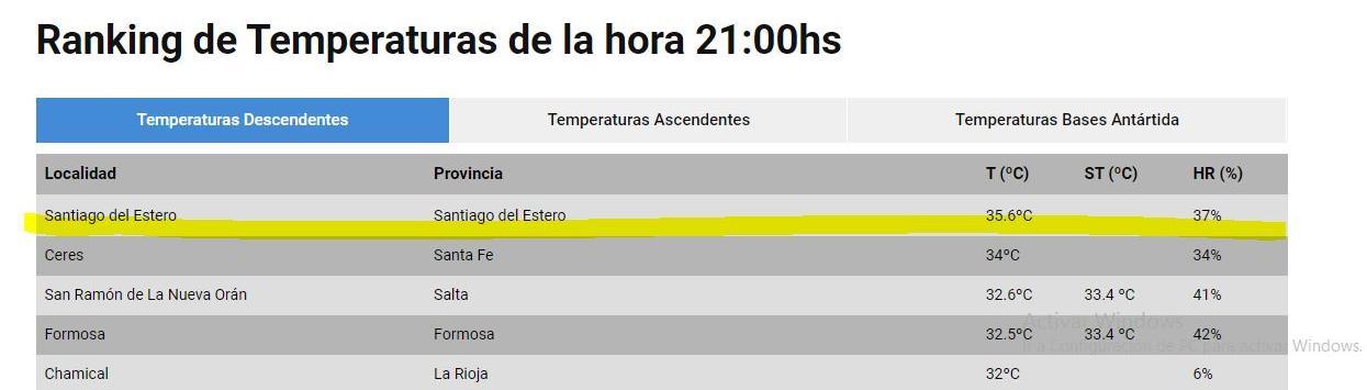 Según el organismo, Santiago del Estero lidera el ranking de ciudades con temperaturas más altas, con una temperatura de 35.6° y una humedad del 37%.