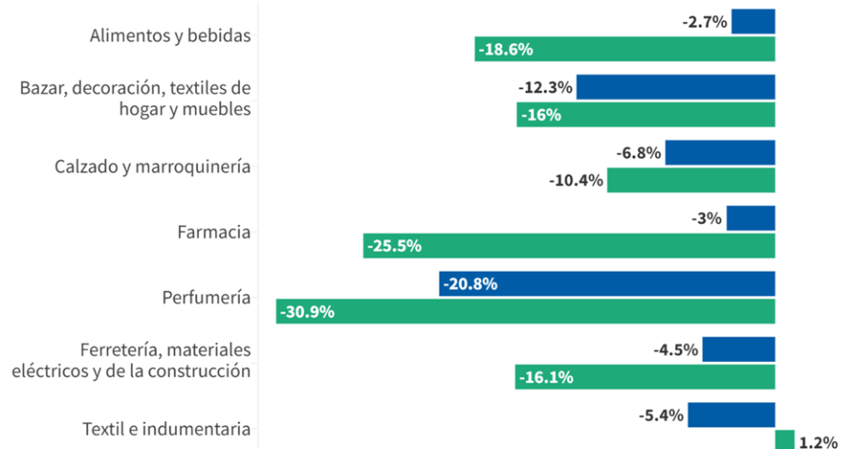 En septiembre, los siete rubros relevados registraron descensos interanuales en sus ventas. La mayor retracción anual se detectó en Perfumerías (-20,8%), seguido por Bazar, decoración, textiles de hogar (-12,3 %). En el acumulado del año, la mayor baja la llevan también Perfumerías (-30,9%) y Farmacias (-25,5%).