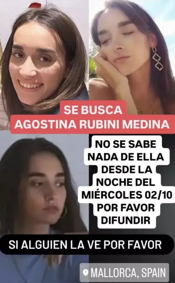 Familiares y amigos de la joven publicaron varias fotos de Agostina en las redes sociales, entre ellas, una tomada el mismo día de su desaparición en el baño de un bar, el cual podría ubicarse en la zona de Santa Catalina o el Paseo Marítimo de Palma.