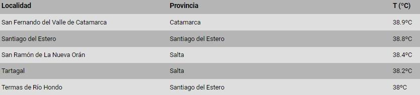 Según informó el Servicio Meteorológico Nacional (SMN), Santiago del Estero se ubica en segundo lugar del ránking de provincias más calientes de la Argentina, con 38.8ºmientras que el primer puesto se lo llevó San Fernando del Valle de Catamarca con 38.9º.
