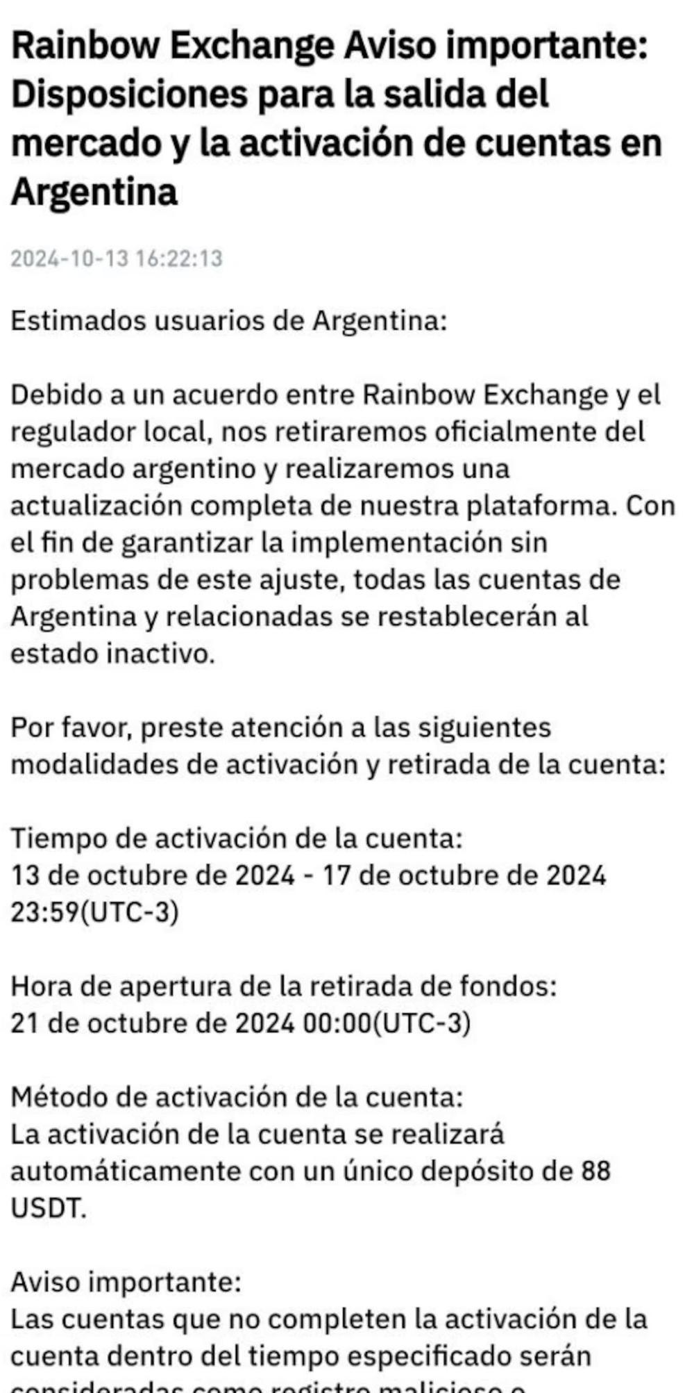 "Debido a un acuerdo entre Rainbow Exchange y el regulador local, nos retiraremos oficialmente del mercado argentino y realizaremos una actualización completa de nuestra plataforma", comienza el comunicado.