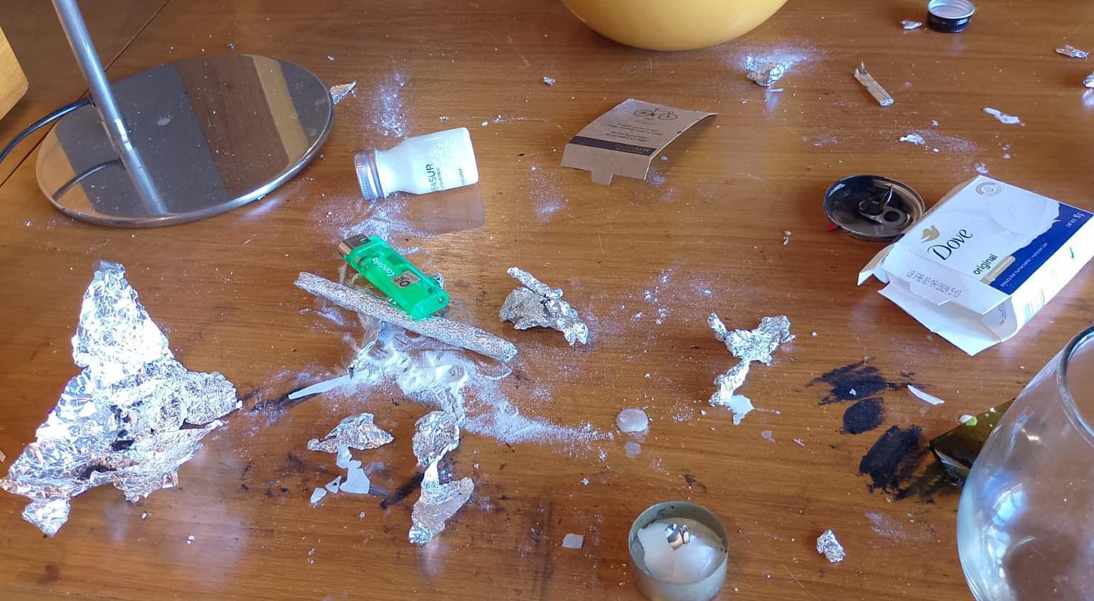 También hay un encendedor y la parte superior de una lata de gaseosa con el metal quemado.