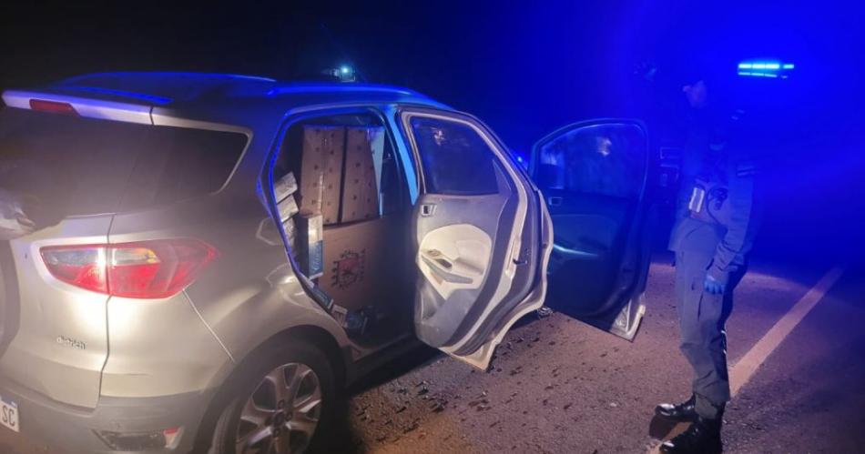 Ante este hecho, los uniformados efectuaron un rastrillaje y hallaron el auto abandonado a la vera de la arteria provincial. Al realizar las consultas sobre los antecedentes del rodado, los funcionarios detectaron que tenía pedido de secuestro por robo en la Ciudad Autónoma de Buenos Aires y al requisarlo, constataron la presencia de 14.000 paquetes de cigarrillos de origen extranjero, cuyo avalúo es de 31.800.000 pesos.