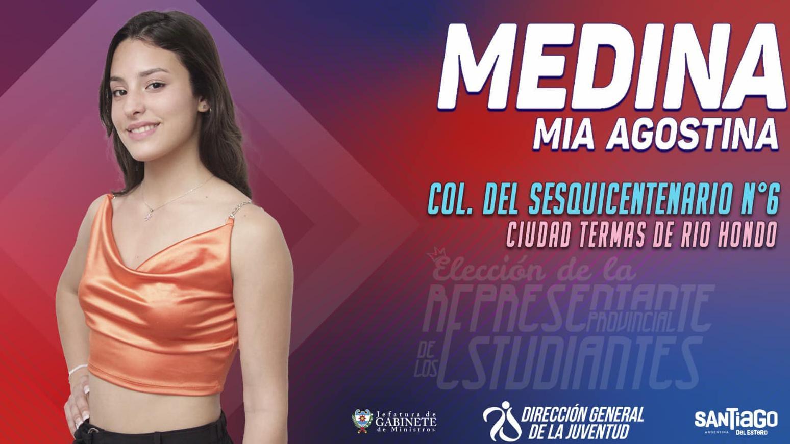 Este sábado, en la ciudad de Las Termas, la joven Mia Agustina Medina, fue elegida como la Representante de los Estudiantes de la Provincia, por lo que representará a Santiago del Estero en la elección a nivel nacional que se realizará el 29 de septiembre en Jujuy. Fue coronada por el intendente de la Las Termas, Jorge Mukdise, Alejandra Maglietti y Ariel Zorribas.