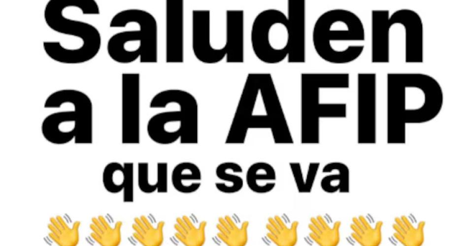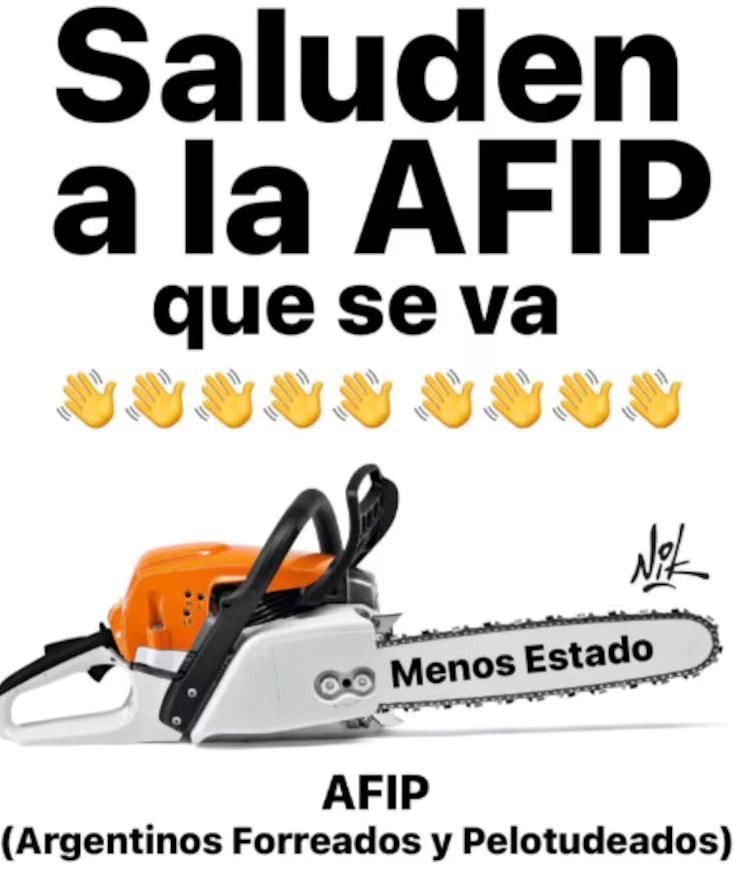 Fiel a su estilo, Javier Milei utilizó sus redes sociales para expresar su sentir luego de que el Vocero Presidencial anunciara este lunes la disolución de la AFIP por parte del Gobierno. "Saluden a la AFIP que se va", dice la foto que muestra una motosierra que compartió a través de Instagram. En la imagen también da a entender que la sigla del organismo significa "argentinos, forreados y pelotudeados".