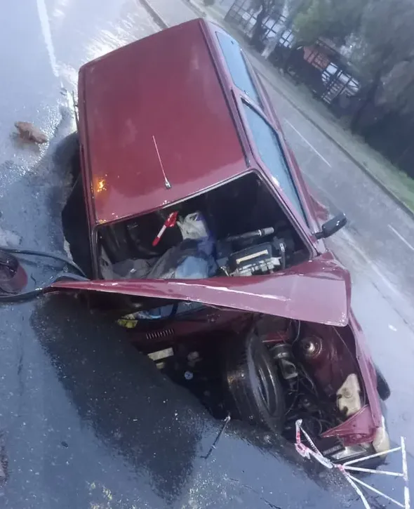 El conductor de 47 años identificado como P.C.S., circulaba en un Fiat Uno de color bordó. Mientras transitaba bajo la lluvia, su automóvil cayó lateralmente en el socavón, del que hasta ahora se desconoce cómo se generó.