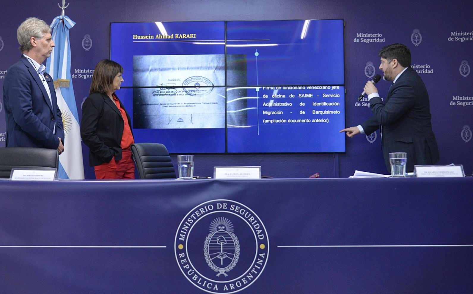 En conferencia de prensa, frente a medios nacionales e internacionales, Bullrich señaló que se pudo determinar que Karaki entró en enero de 1992 a la Argentina. Había estado en nuestro país, Brasil y Paraguay entre 1990 y 1991, reclutó a José Suleiman en San Pablo (Brasil) para el contrabando de explosivos y entró en la Argentina con documento colombiano bajo el nombre de Alberto León Naím. "Este señor fue el que compró y preparó la camioneta que explotó en la embajada de Israel. Hoy venimos a aportar el dato de la persona de Hezbollah, jefe en Latinoamérica, que compró la autobomba a nombre de Elías Ribeiro Dalush, con documento brasileño falso número 34 031 567, y que, unas horas antes del atentado, salió por el aeropuerto Jorge Newbery de la ciudad de Buenos Aires, rumbo a Foz de Iguazú", precisó.