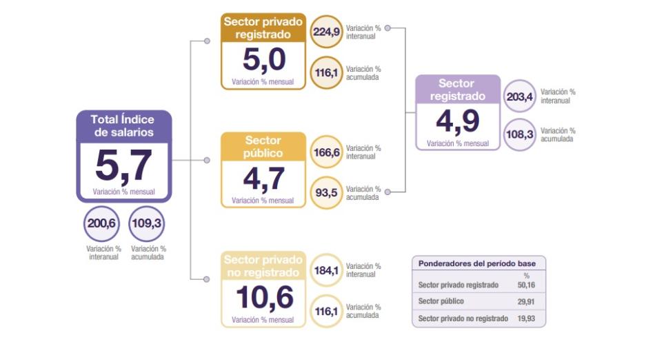 Los sectores que impulsaron la suba fueron el privado registrado:+5%, el público, +4,7%, y el privado no registrado, +10,6%.