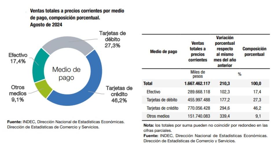 A su vez, los que subieron también son los "otros medios de pago" como lo son las aplicaciones y billeteras virtuales. En enero un 7% de las compras se pagaban con estos medios alternativos. Pero en agosto, llegaron al 9,1%. En forma interanual pasaron del 6,4% al 9,1% de los pagos.