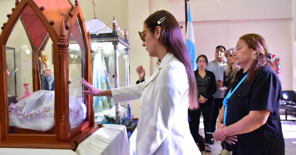 La imagen de la Virgen "Morenita" del Valle llegó al edificio municipal a las 8, donde fue recibida por el intendente municipal, Humberto Salim, acompañado por el secretario de Gobierno, Sebastián Salim y el resto de los funcionarios que integran el gabinete y empleados comunales que trabajan en la administración central del municipio.