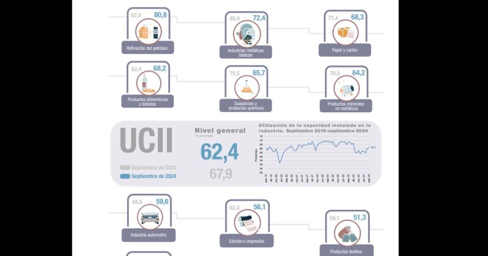 La utilización de la capacidad instalada en la industria se ubicó en 62,4% en septiembre, por debajo del 67,9% del mismo mes de 2023, informó el Indec.