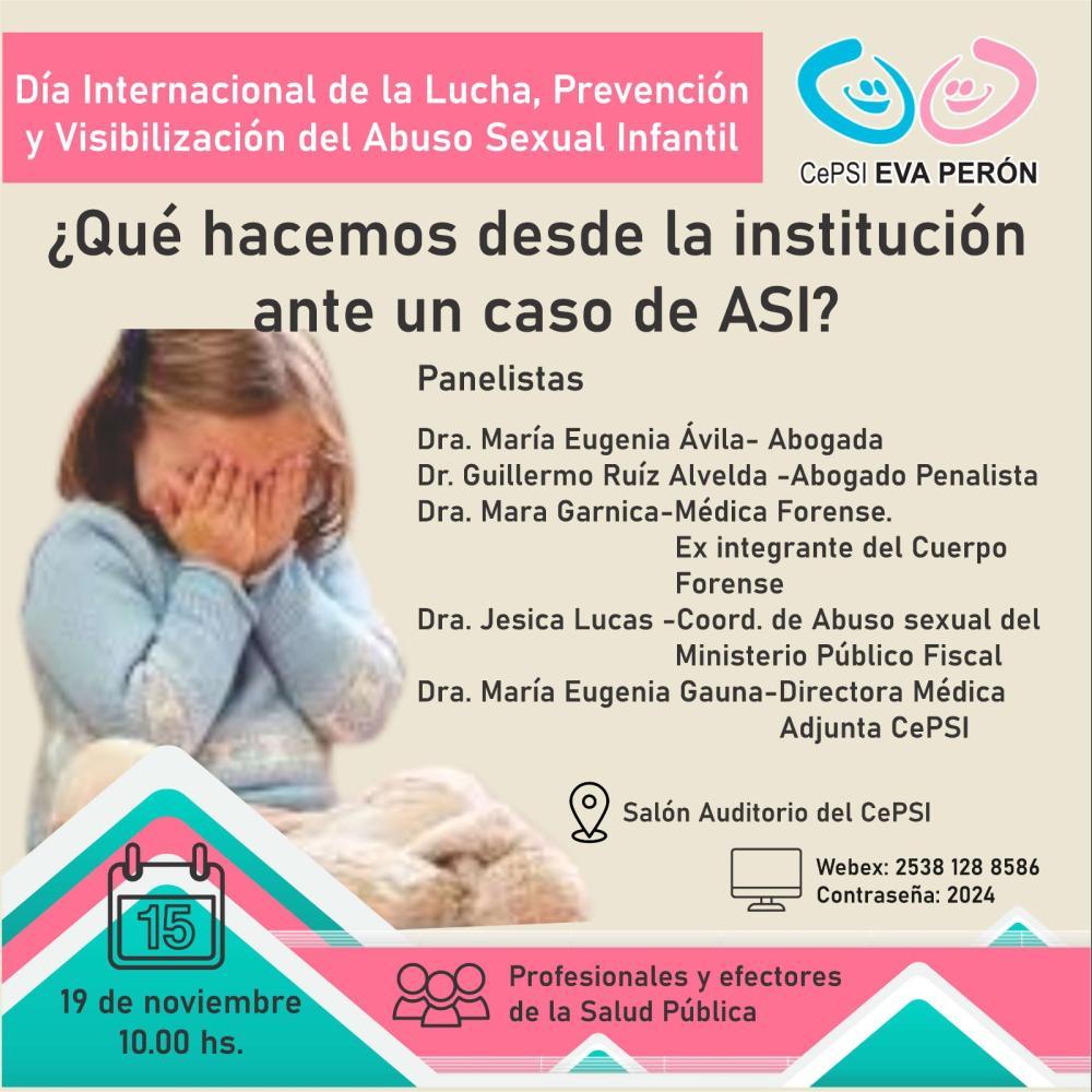 El próximo martes 19 de noviembre se llevará a cabo una capacitación dirigida a profesionales y trabajadores del ámbito de la salud, titulada "¿Qué hacemos desde la institución de salud ante un caso de ASI?" (Abuso Sexual Infantil). La actividad es gratuita y se desarrollará en modalidad híbrida, permitiendo la participación tanto presencial como virtual.