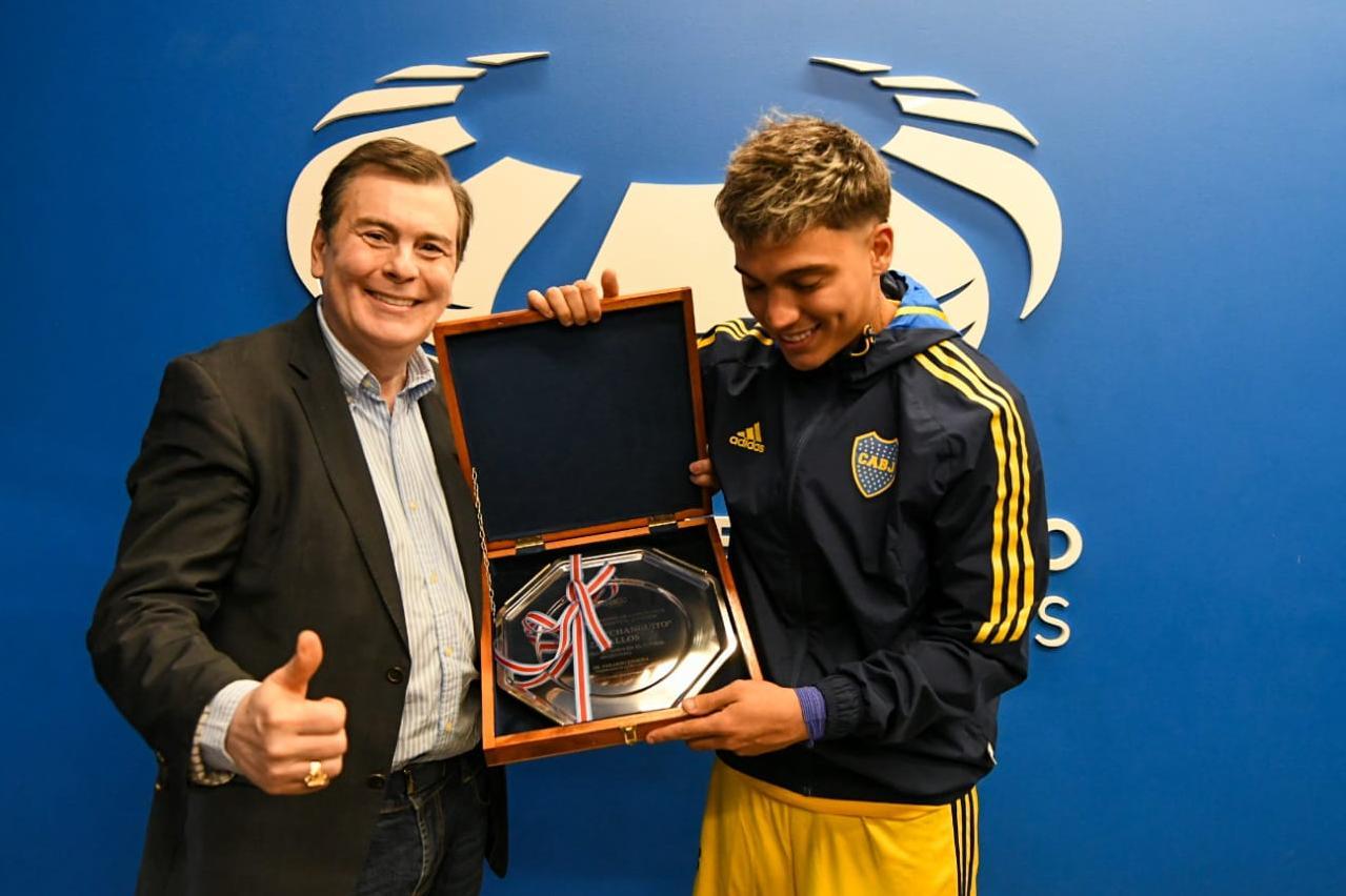 Finalizado el partido disputado este martes a la tarde entre Central Córdoba y Boca Juniors en el Estadio Único "Madre de Ciudades", el gobernador Gerardo Zamora entregó a Exequiel "Changuito" Zeballos una plaqueta de reconocimiento por parte del Gobierno de la provincia por su trayectoria en el más alto nivel del fútbol argentino.