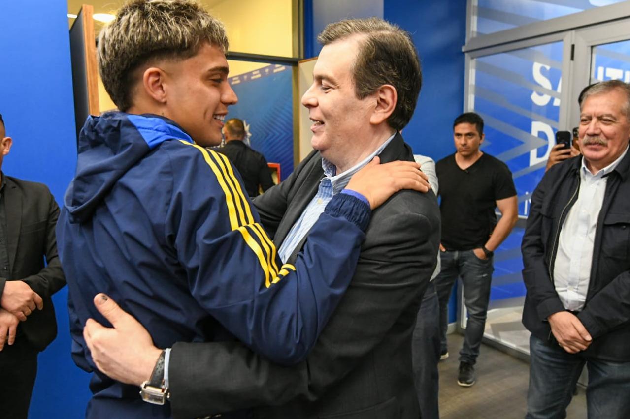 El mandatario estuvo acompañado en esta oportunidad por el jefe de Gabinete de Ministros, Elías Suárez, quien también felicitó al joven jugador santiagueño por su gran momento en uno de los equipos más importantes del país.