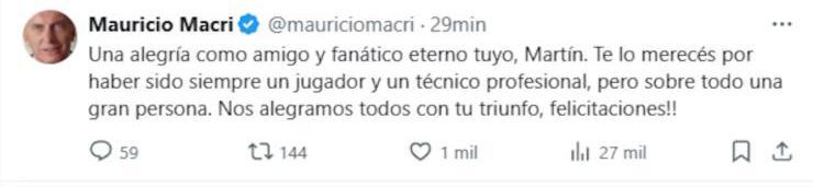 "Una alegría como amigo y fanático eterno tuyo, Martín. Te lo merecés por haber sido siempre un jugador y un técnico profesional, pero sobre todo una gran persona. Nos alegramos todos con tu triunfo, felicitaciones!!", escribió el expresidente de la Nación.
