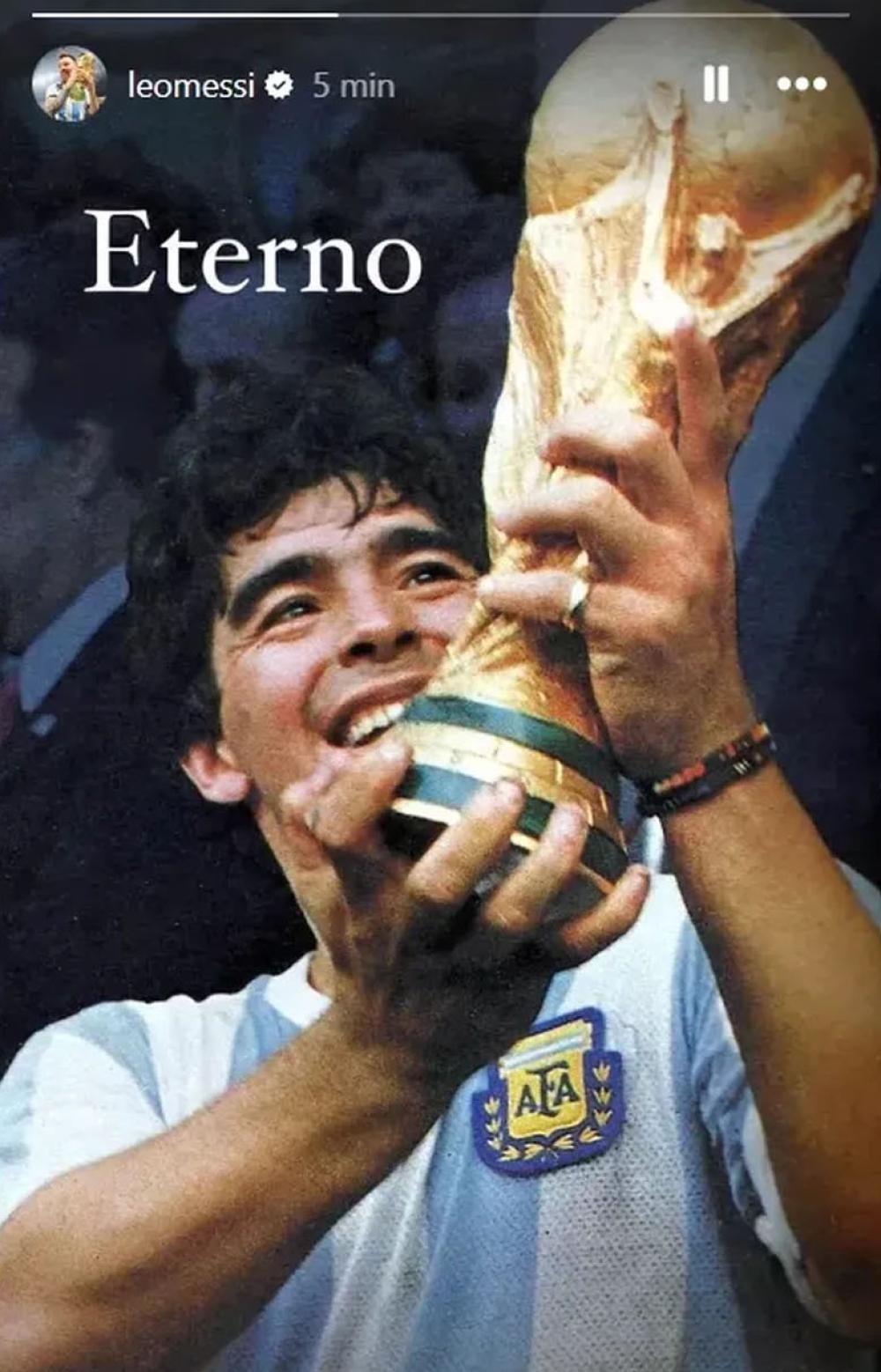 "Eterno", escribió el capitán de la Selección argentina sobre una foto en la que se ve a Maradona levantando el trofeo obtenido en el Mundial de México 1986.