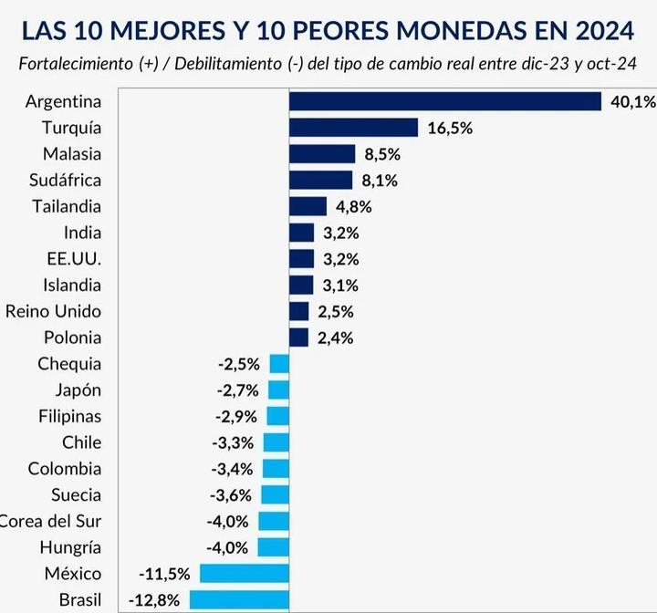 Abajo quedaron Turquía, que vio la lira apreciarse un 16,5%; Malasia en tercer lugar con 8,5%; y Sudáfrica en 8,1%; mientras que Brasil, principal socio comercial de Argentina, devaluó un 12,8% en los primeros 10 meses del año.