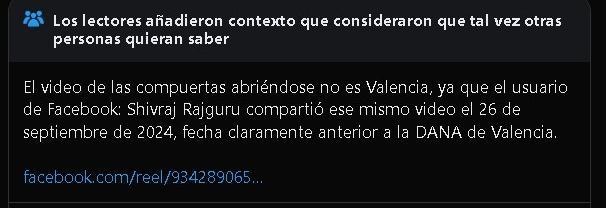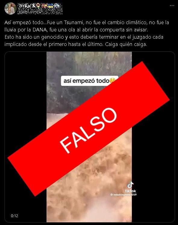 Circula en redes sociales un video en el que se observa unas compuertas abriéndose y provocando inundaciones, bajo la siguiente descripción: "Así empezó todo...Fue un Tsunami, no fue el cambio climático, no fue la lluvia por la DANA, fue una ola al abrir la compuerta sin avisar. Esto ha sido un genocidio y esto debería terminar en el juzgado cada implicado desde el primero hasta el último. Caiga quién caiga". Pero esto es falso. El video no fue tomado en España, en medio de las inundaciones por la DANA; sino que fue publicado el 26 de septiembre de 2024 por un usuario de X de la India, antes de los desastres ocurridos en Valencia.