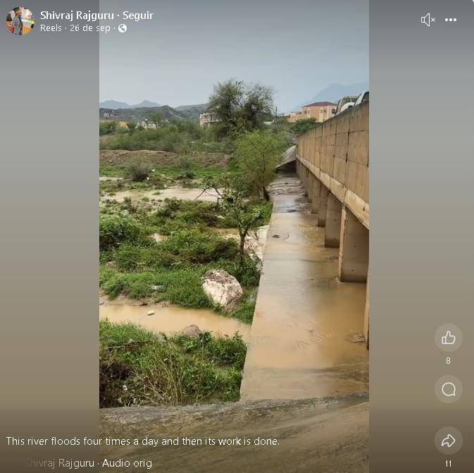 El video fue publicado en Facebook por un usuario de la India bajo el nombre de Shivraj Rajguru el pasado 26 de septiembre, un mes antes del desastre natural ocurrido en España Acompañó las imágenes, con una frase en inglés: "This river floods four times and then it work is done" ("Este río crece cuatro veces y luego se hace el trabajo").