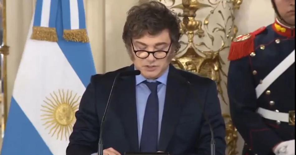 El presidente Milei habló desde la Casa Rosada rodeado de su gabinete ministerial completo.